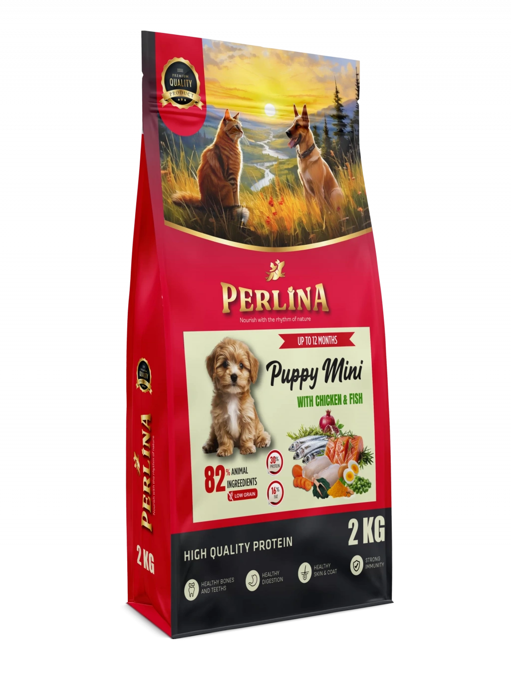 Perlina Yavru Köpek Tavuklu Köpek Maması 2 KG, 12 aya kadar olan küçük ırk yavru köpeklerin sağlıklı gelişim ve büyümesini desteklemek için özenle formüle edilmiştir. %82 hayvansal içerik, en az %15 tavuk eti ve %15 balık (somon ve hamsi) ile yüksek kaliteli protein sunar. Havuç, bezelye ve nar gibi doğal içerikler bağışıklığı güçlendirirken, zerdeçal ve spirulina genel sağlığı destekler. Düşük tahıllı yapısıyla sindirimi kolay, lezzetli ve dengeli bir beslenme sağlar.