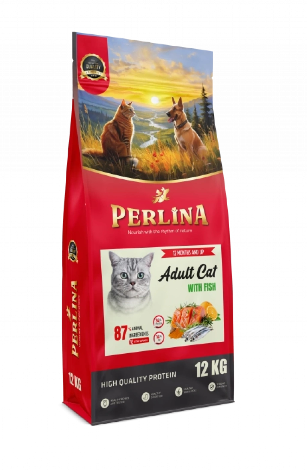 Perlina Yetişkin Kedi Balıklı 12 KG Kedi Maması, 12 ay ve üzeri kedilerin sağlıklı yaşamını desteklemek için özel olarak formüle edilmiştir. %87 hayvansal içerik oranına sahip bu mama; somon ve hamsi (%15) gibi yüksek kaliteli balık proteinleri, et ürünleri, vitamin ve mineraller ile kedinizin enerji ihtiyacını karşılar. İçeriğindeki taurin, biberiye ve zerdeçal sayesinde bağışıklık sistemini güçlendirir, sağlıklı tüy ve deri yapısını destekler. Düşük tahıllı formülüyle sindirimi kolay, lezzetli ve besleyici bir öğündür.