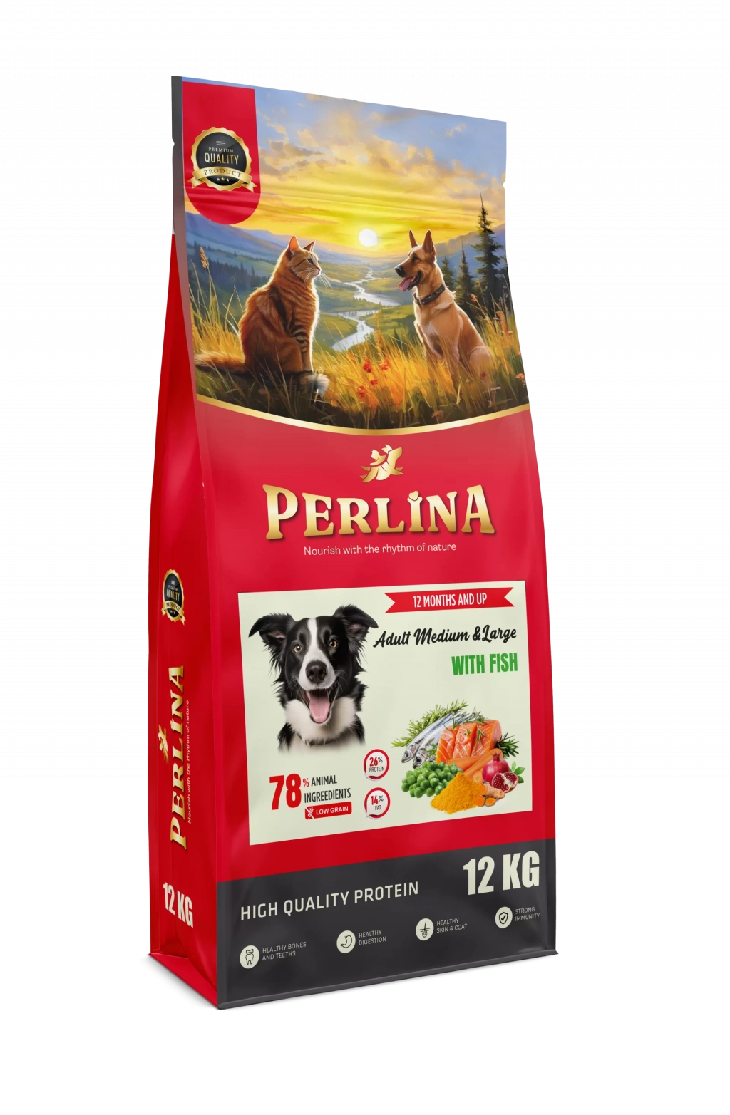 Perlina Yetişkin Orta & Büyük Irk Balıklı Köpek Maması 12 KG, 12 ay ve üzerindeki orta ve büyük ırk köpeklerin enerji, protein ve vitamin ihtiyacını karşılamak için özel olarak formüle edilmiştir. %78 hayvansal içerik, %15 somon ve hamsi ile yüksek kaliteli protein kaynağı sunar. Havuç, bezelye ve nar gibi doğal içerikler bağışıklığı desteklerken, zerdeçal sindirim sağlığını korur. Vitamin ve mineral takviyeleri kas yapısı, kemikler ve tüy sağlığını güçlendirir.